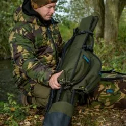 Vaste-hengelfoedraal met stevige voering voor optimale bescherming van hengels en topsets. De binnenzijde van de foudraal is aan weerszijden voorzien van een groot opbergvak en twee elastieken over de gehele breedte, waardoor voor ieder formaat koker de beschikbare ruimte optimaal benut kan worden. Het brede en lange opbergvak aan de voorkant kan gebruikt worden voor een paraplu, diverse steunen of enkele hengel extensions. Uitgevoerd met luxe gevoerde draagriem en neopreen handvat.