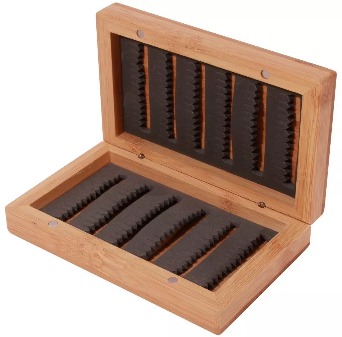 De Ultimate Bamboo Fly Box is gemaakt van bamboe en daarom superlicht van gewicht. De fraaie box is aan de binnenzijde voorzien van voorgestanst foam en biedt ruimte aan meer dan 100 vliegen. Afgewerkt met magneetsluitingen en soepele scharnieren.